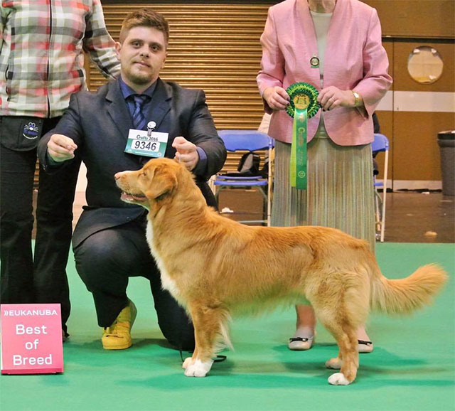 Due eccezionali risultati BEST OF BREED e DOG CHALLENGE CERTIFICATE ha ottenuto Nova Scotia Duck Tolling IT/LUX CH STEVE MCQUEEN DI CASA TOLLER (DOB 23/01/2012) di Carlo Paraluppi, condotto di Mirko Guolo, allevamento Di Casa Toller di Guolo & Ludovico.