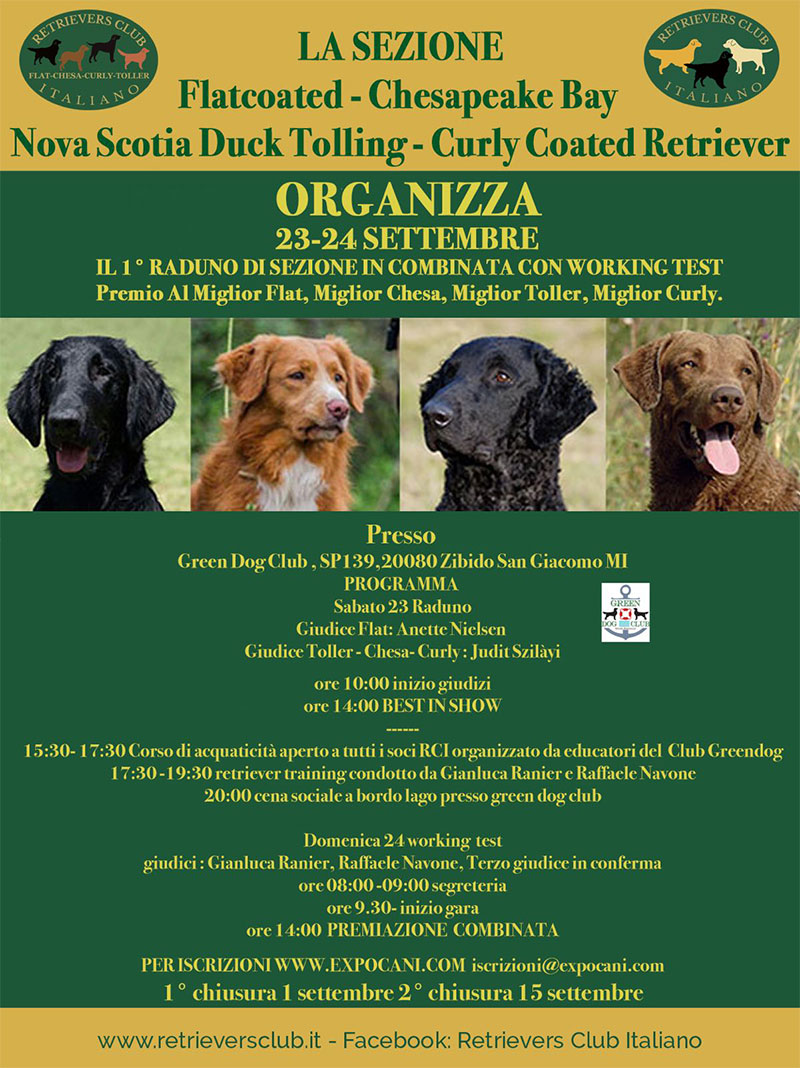 La Sezione Flat e Altri organizza 23-24 settembre 2017 presso Green Dog Club Zibido San Giacomo (MI) il 1° Raduno di sezione in Combinata con Working Test in collaborazione con la Sezione Lavoro.