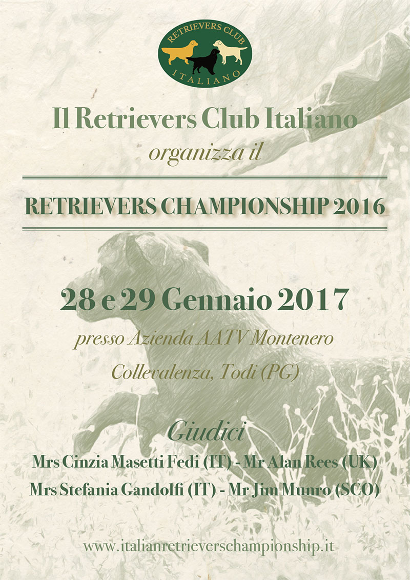 Retrievers Championship si svolgerà il 28 - 29 gennaio 2017 presso Azienda AATV Montenero Collevalenza, Todi (PG).