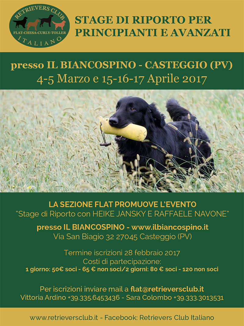 La Sezione Flat in collaborazione con la Sezione Lavoro organizza cinque giornate di riporto presso Il BiancoSpino Centro Cinofilo, Via San Biagio 32 Casteggio (PV).